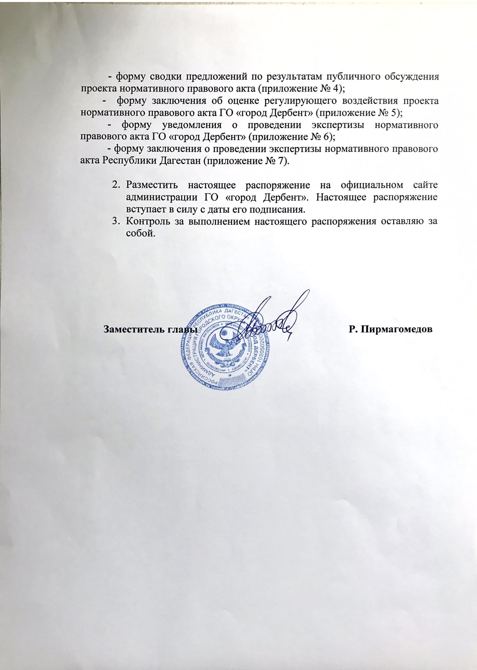 В соответствии с пунктом [соответствующий номер пункта] Порядка необходимо провести процедуры, предусмотренные пунктами _____ Порядка, начиная с (указывается невыполненная процедура), и доработать по их результатам проект акта, после чего повторно направить в администрацию городского округа «город Дербент» для подготовки заключения.