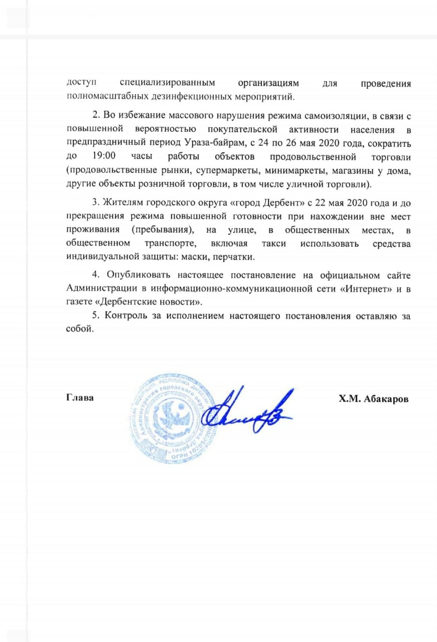 Глава Дербента Хизри Абакаров подписал постановление об усилении мер по предотвращению распространения новой коронавирусной инфекции (COVID-19)